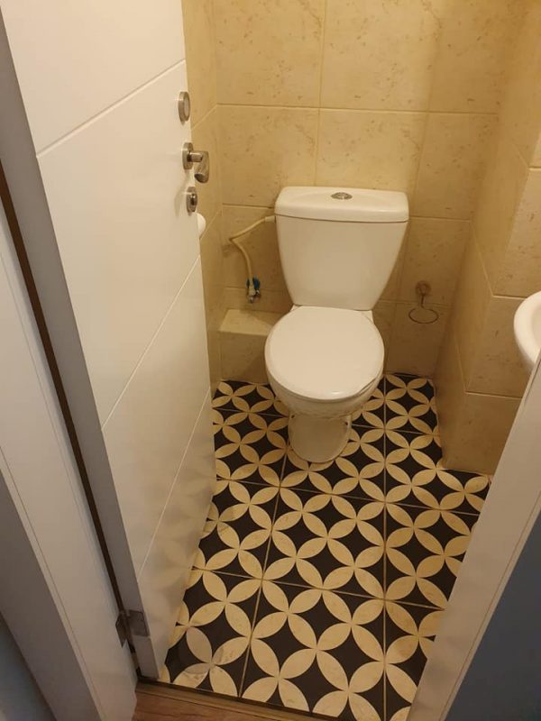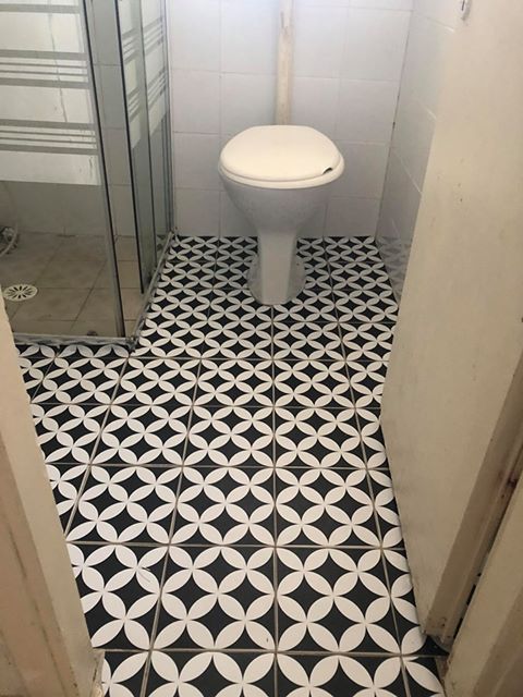 שימוש במדבקות אריחים שקופות בחדר שרותים. שימו לב שעדיין השחור דומיננטי ועושה את העבודה, אך האריח עצמו משתלב עם המדבקת אריח שנראה אמיתי לחלוטין.