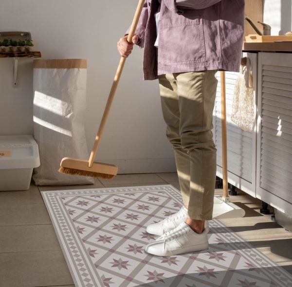 – יישר את המדבקה על רצפת האריחים, לאורך הקווים של האריח